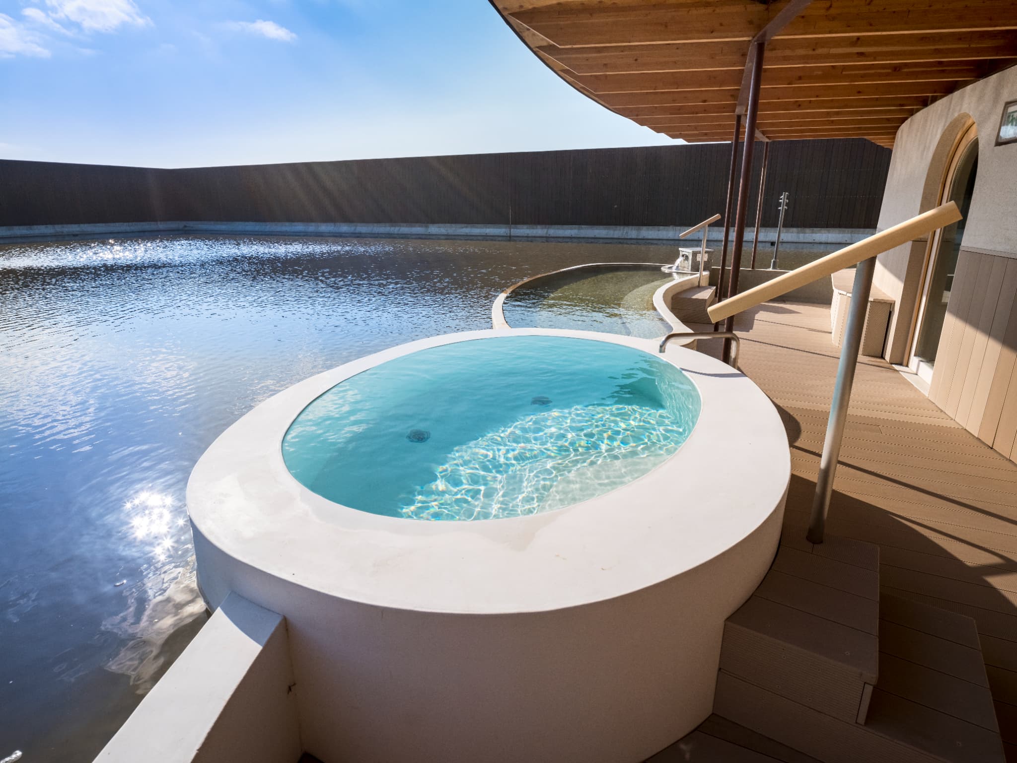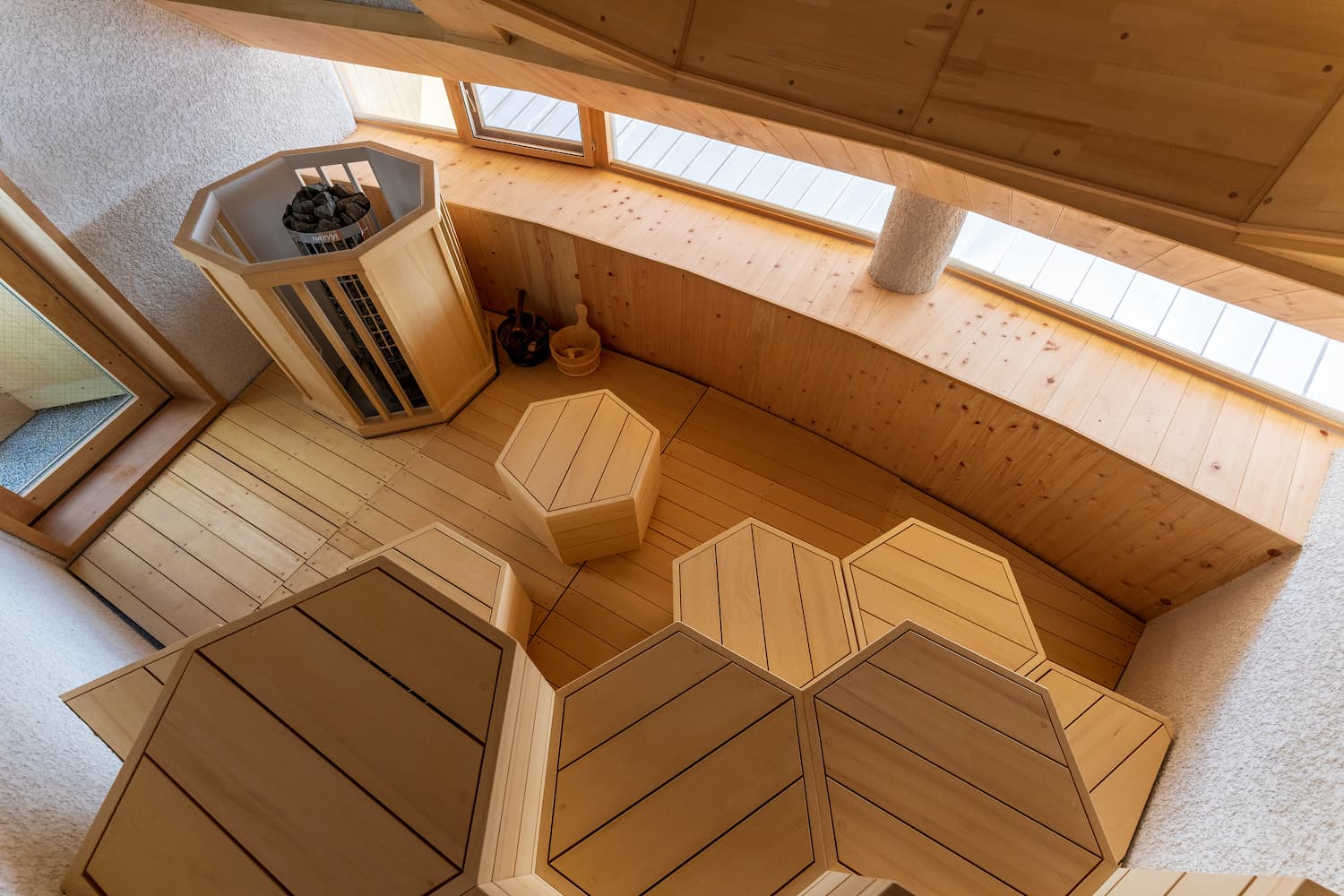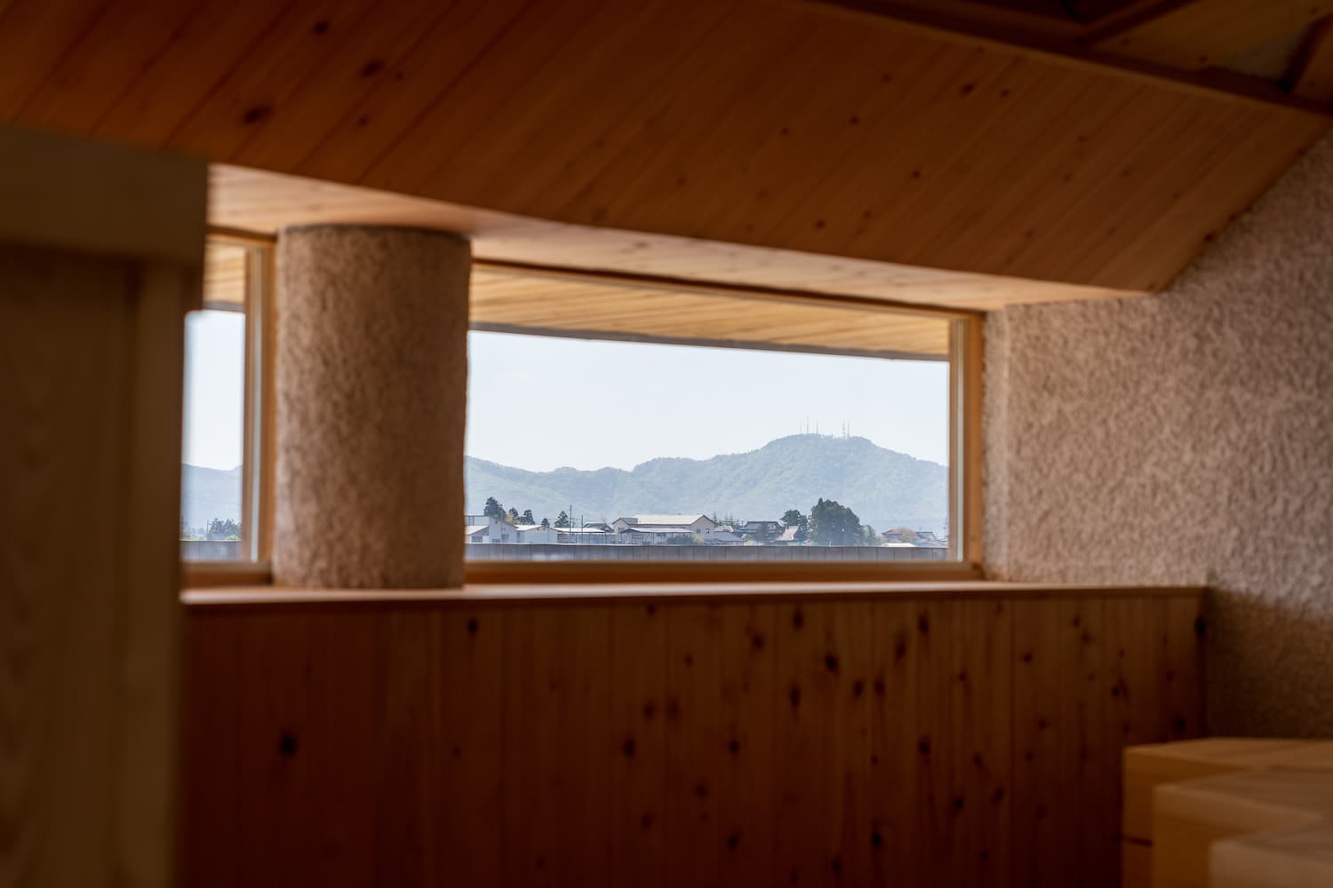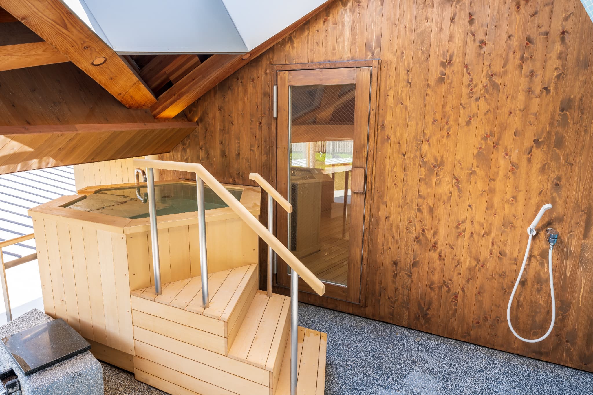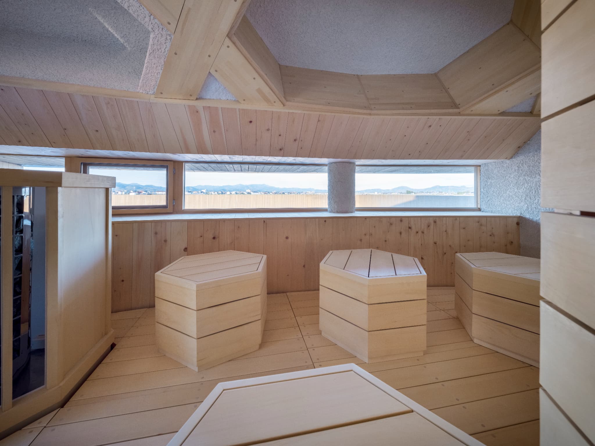 The sauna room has a large window that allows visitors to relax and sweat it out slowly while enjoying the changing scenery and the water-basin on the terrace.