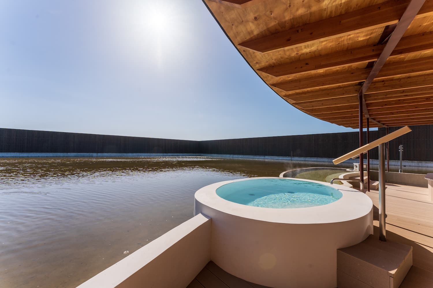 サウナ空間では、坂茂建築の代表的なモチーフである紙管を模したベンチを設け、椅子のかたちを天井のあらわしと同じ六角形にするなど、一体感のあるデザインに。サウナ室には大きな窓を設けており、移り変わる景色やテラスの水盤を眺めながら、じっくりと汗をかき、くつろいで過ごせる空間となっている。