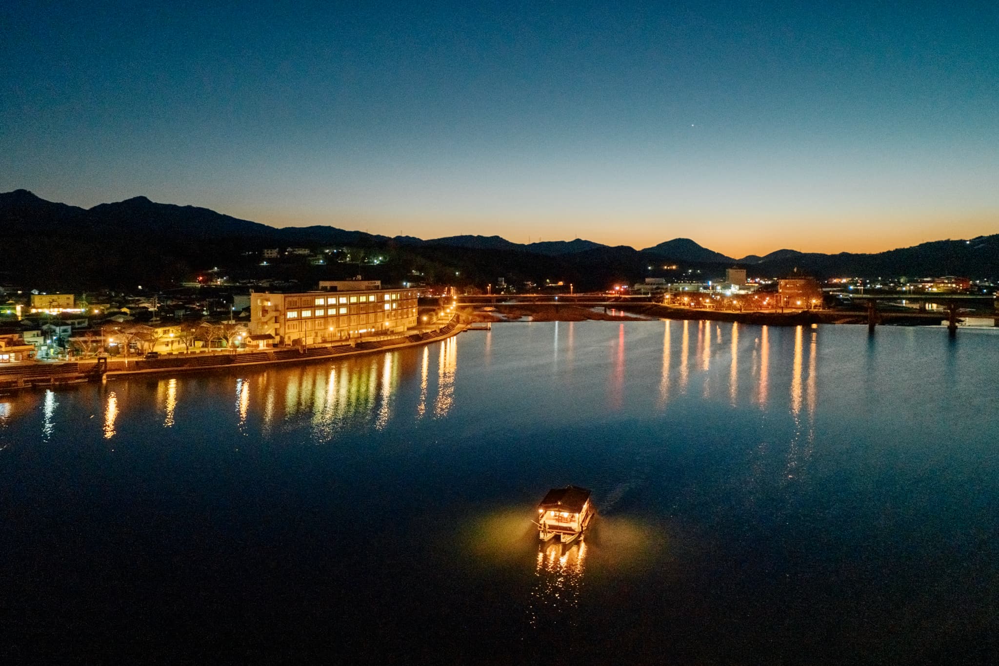 旅館前を流れる三隈川で日田の風物詩「屋形船」を見ながらサウナに入る体験をぜひ楽しんでほしい。